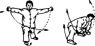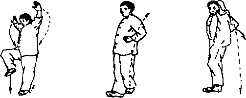 动作提要右腿向左起摆时上体要微右转两手相叠右摆当右脚摆到右侧时两手依次汇摆。