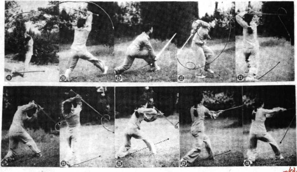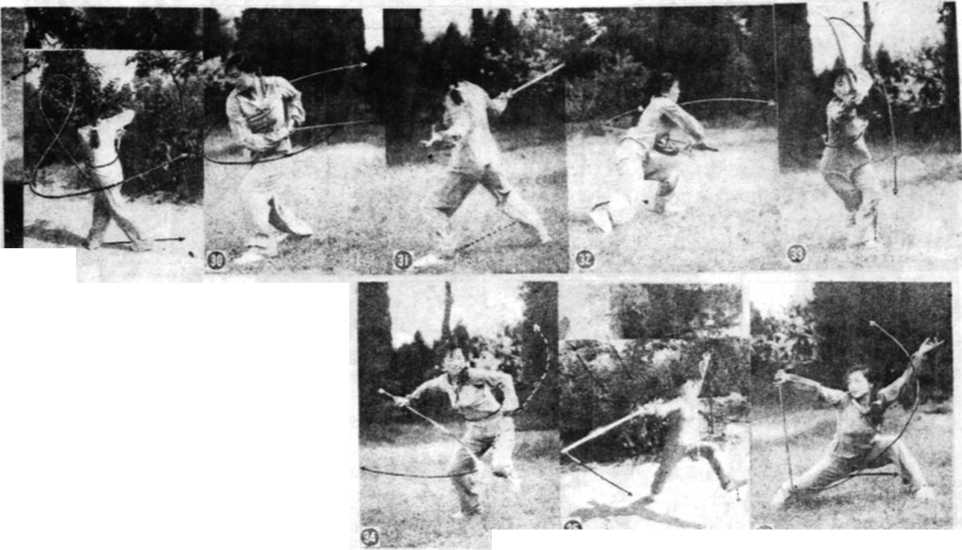 动作两脚蹬地左脚向前挫步,右解速向后滑动同时右手外旋左手内旋使剑从身体右侧向上、向后撩起一周止动上裁腰左拧(25)。紧接看向右转腰右手变内旋腕左手外旋使剑向右侧前下方截出8随之右脚向右前方上步(图26)。
