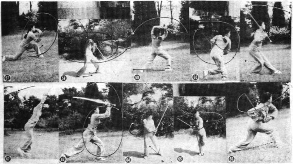 动作上动不停,右胸落于左初前双手握剑(图53)向左转仰身抬头左脚提起脚背扣于右膝后,右手内旋腕后转外旋左手活把随籽身体转动白左向右平云一周(图54、55、56)。双手握剑竟刃刺出同时左脚范于左侧前方成8(步型面向东南目视前方(图57)。妥领云剑时必须蜀转手腕使剑平刃过攻。抬头仰身的同时挺腰胯。剌剑时手臂并没完全伸直而是用整个身体催剑前刺。