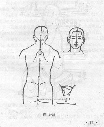 中枢、筋缩、至阳、灵台、神道、陶道、大椎、哑门、风府脑户、强间、后顶、百会、前顶、囱会,上星神庭、素修、水沟、兑端龈交(共二十七穴)。