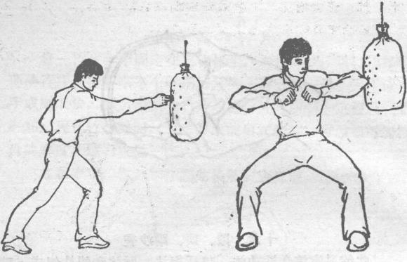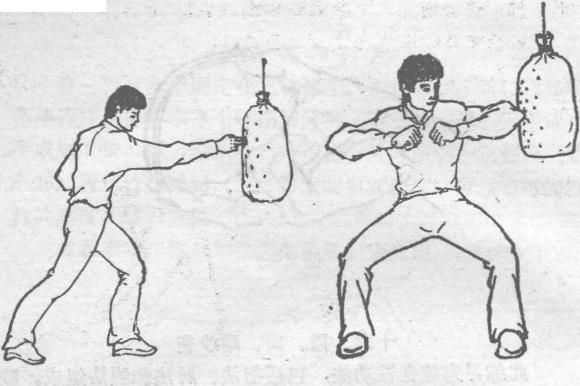 沙袋是在沙袋上根据不同颜色点醒目的不同色彩而后用食指或中指进行单指点击也可食、中指并用点击步法不限在不同的点上快速练习以增强指力和增加反应的灵敏度便于实战(图2-38)。顶沙袋为肘法练习在和用指法练习的同样沙袋上用肘依次顶击动作要快、稳、准、猛,力图一击奏效。肘法须结合步法以适应上下变换(图2-39)。踢沙袋是对不同颜色标出的点上用脚法进行踢点。要体现脚法的特色(图2-40)。