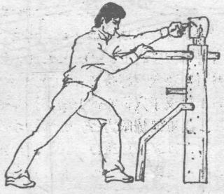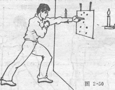 在硬地面上立一人型木柱突出部位如头部等身体要害要认真制作标出。攻点三路的要点在武术动作的综合屋用之上主要用点穴手型、肘、脚对木人桃的上、中下各部穴位进行攻点以练克敌制胜的效果(图2-51)注春事项1练习时多假想对方也在进攻故而点击要准、快、狠。2要结合绕进等步法对侧背面的穴位进行攻点