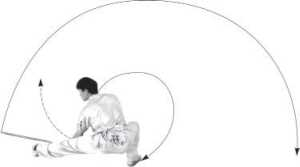 (2)左扣腿撩击棍:上动不停,随体右转约180度,右脚顺势向右侧外摆进步支 撑为轴,左脚提起勾扣于右膝窝处成左扣腿。同时,右手握棍使棍梢领先向左上、左下 立弧形撩棍,顺势向左反撩击棍至左侧斜下举棍,力达棍稍段。同时,左手顺势向左下 接握棍把段,与右手合握棍同向左撩棍,左手心向左,右手心向上于体前交叉握棍把中 段,两肘均屈。目视棍梢方向(图8.2.205)。
