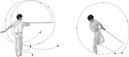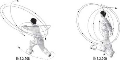 (1)跳换半马步举棍:上动不停,右脚上提起,随即左脚蹬离地换跳步,同时体向 右转180度,右、左脚依次落地,经半马步状过程。同时,两手握棍使棍梢向左下摆,随 即左手先向棍梢方向滑握把使棍梢向上、右下立弧形摆动,左手再向棍中段方向滑握成 棍把端向左斜下举。左臂屈,前臂于右肩前平举,手心向下盖握棍中段;右臂屈,手心 向内下握棍。目视棍梢方向(图8.2.202)。