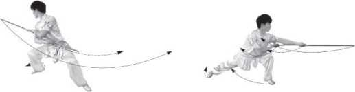 上动不停,两脚 同时向左前摆落地成左仆步。随体 右转45度,两手握棍弧形向左下沿左 仆腿内侧地面平摔棍,棍梢向左斜前 方。右臂屈肘,右手心向下握棍把于 腹前地面处;左臂稍屈,手心向下握 棍中梢段触地;上体向前倾压。目视 棍梢方向(图8.2.199),弓步摔棍:接上动。随体右 转约45度,右脚上蹬成右弓步。同 时,右手握棍顺势立弧形经上向右下 摆至右侧地面平摔棍,棍梢向右,上 体向右侧倾压。右臂稍屈,手心向下 握棍把于右脚前;左手脱离棍,直臂 向左侧稍斜上平举,掌心向前。目视 右侧下方(图8.2.200)。