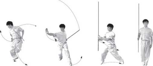 (1)左转并步平举棍:接上动。左脚上蹬支撑为轴,随体左转约90度,右脚提起收 至左脚内侧成并步站立。同时,右手握棍顺势向左摆至胸前屈肘平举棍,棍梢向右,右 手心向内于胸前握把段,臂平举,肘尖朝右;左臂顺势向左侧摆成反臂左斜下举。目视 棍梢方向(图8.2.204)。