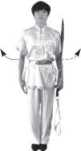 12.并步扎刀:上动不停,右脚支撑,左脚提起 收至右脚内侧成并步站立。同时,右手螺把持刀,随左脚进步顺势向右侧扎刀平举,刀刃向下,臂伸直,手心向前;与右扎刀同时,左臂掌向左侧伸摆平举,掌心向前。目视刀尖方向(图 8.3.17)。