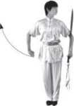 14.剪腕花分腿站背举刀:上动不停,左脚稍后移撑, 两腿屈膝经分腿站过程。同时,右手持刀随体左、右自然 转动,于体前、体后剪腕花,随即顺势向体后立圆摆至背 后成左斜上举刀,刀尖向左斜上,刀刃朝左,右臂屈,右 手心向后握刀于背后并以手背侧触靠腰右侧;左臂掌体侧 自然摆动,顺即向右上屈臂摆至右胸前立掌,掌心向右, 指尖朝上。目视体前方向(图8.3.19)。
