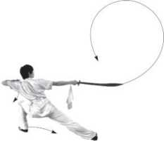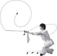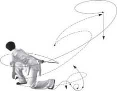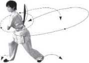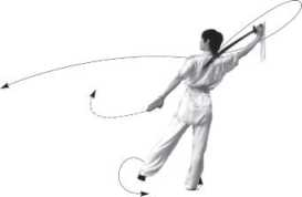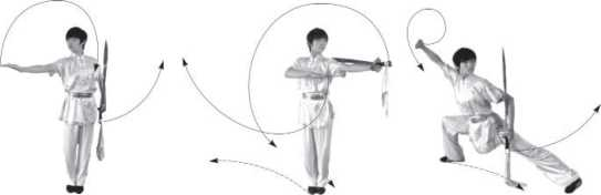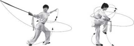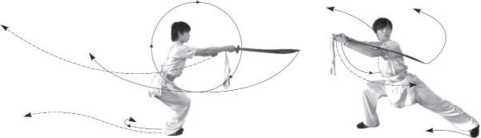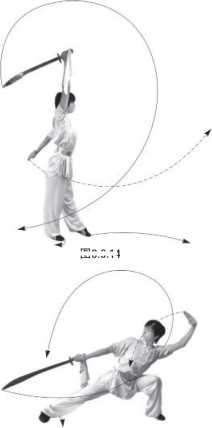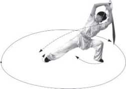 6.屈蹲抡扫刀:接上动。右脚支撑为轴,随体右转约135度,左脚稍向内收移,前 脚掌折叠蹬撑成屈蹲前俯身状。同时,右手持刀以刀刃领先沿地面向左,经体前向右后抡扫刀一周至体右侧斜后下方举刀,刀刃向右斜后,臂伸直,手心向下;与右转扫刀 同时,左臂掌向左侧摆至左侧斜下举,臂稍屈,掌心向左后斜上。目视扫刀方向(图 8.3.9)。