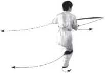 步背后举刀:接上动。右手持刀,臂经内、外旋缠刀;同时,左脚支撑为轴, 随体右转90度,右脚提起向体前迈半步,重心前移经左后点步过程。随体右转,右手持刀顺势向上、后弧形摆成体后上举刀,刀刃向斜后上,刀 尖朝后斜下,右肘微屈,右手心向左活把持刀;左臂顺 势内旋,掌向左后斜下摆成反臂斜下举。目视前方(图 8.3.18)。