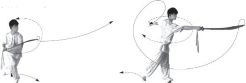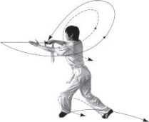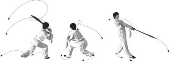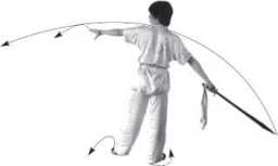 (2)左外摆进步接刀平举:上动不停,右脚支撑为轴,随体左转约90度,左脚向左 外摆进步经屈膝叉状步过程。同时,右手握刀以刀背领先向左前方平摆举,臂屈,右手
