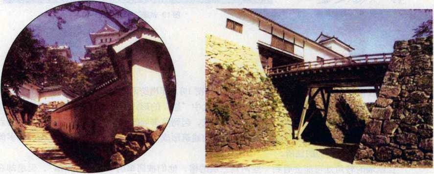 人们需要经过大路来进入结构复杂的城堡,这些通路常以桥为连接[图15],有时还会经过小型石桓,进入城堡大门前的地带被称为玄关,[图16]通向玄关的门被称为“追手门”,是用来隐藏守卫,让其能发动突然袭击。