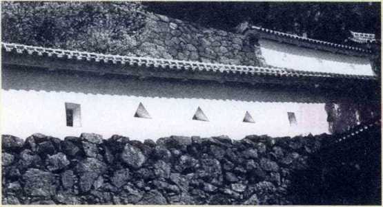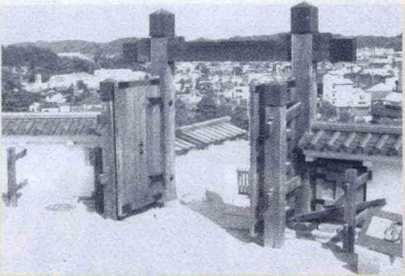 作为上层建筑的一部分,门楼会最先引起拜访者的注意[图17]。而一个城堡的门楼其实就是一个很复杂的防御系统,一对城门立于入 口之上,第一个直接建于通道的上方,有时门前的支撑部上面还建有顶盖以加强防御。第二个,内门被建造得和外门保持一定的角度以让攻城者在进门前必须调整自己的方向。如果城堡建造于山上的话,内城门常被建在比外城门高的地方,熊本城即为一个例子。无论怎样的设计,在两道门之间都存在着一方形的封闭区 来自于用来盛水或粮食的容器。这个区域的另一域,且处于周围的俯瞰之下。这被叫做擀形,个作用是让城堡的指挥官可以于此集中清点他的部队。在沿着城墙的隐蔽处也许还建有小的秘门。门楼内的城门由坚固的木材制作,通过铁质的较链所固定,常常还被以铁钉和铁条加固。