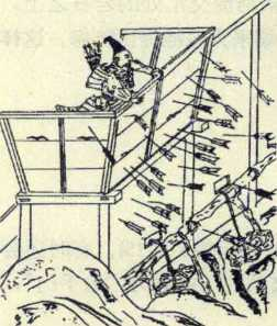 在两场武田家的战役中争夺永源的控制都起到了重要的作用。在1572年的一场战争中,城堡的守军从架在河上的木塔中吊下篮子来取水[图26]。武田胜赖就建造了沉重的木筏顺流而下来冲垮木塔的支柱。