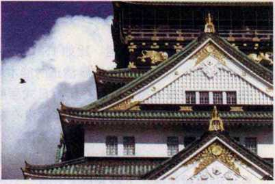 一般来说天守上的窗子会是方形的。至于屋顶,一般是以日本产的青瓦所覆盖,不过在古时候也有使用茅草的。天守最高层的屋脊两端有时会使用金属或陶鎏做成的海豚形状的装饰物,这些饰物被认为具有辟邪,防火的功效。这些饰物有时是镀金的。图22