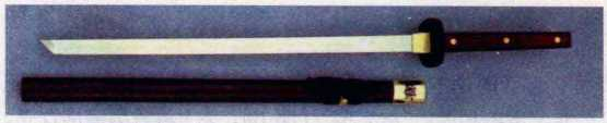 现代人从各种忍术秘本中,所得知的忍术武器主要有七种:手里剑、撒菱、忍刀、吹矢、忍杖、手甲钩、水蜘蛛。手里剑是飞镖,刀尖涂有剧毒[图4]。撒菱,是逃走时撒在身后的一种菱形武器[图5];忍刀[图6],附有一条长约三公尺的绳子,翻越城墙时,可以当踏脚工具,再利用绳子收回