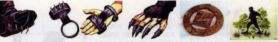 刀鞘,临危时可以当潜在水中的通气管。吹矢则是毒针,通常藏在笛子内(有时候旅途中忍者必需扮装成艺人,因此,忍者除了必须学吹矢手法,还得练习吹笛技术);忍杖,顾名思义,是一根藏有链子、长矛、刀剑等武器的手杖;手甲钩[图7],各式各样,有装在指甲上的,有套在手背上的,就看当事者擅长哪种功夫;水蜘蛛,渡河时用的道具,平时可以叠起来藏在包。