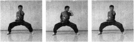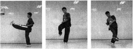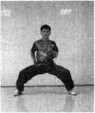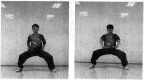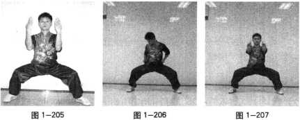 踏步:并步站立,一腿屈膝上提,支撑腿屈膝下蹲的同时全 脚掌用力向地面踏击(图1-188)。