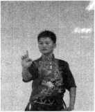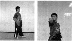 第一章武术套路运动推指:单指或双指,手从腰间由慢而快向前推出(图1-185)。 要求:力达手指。