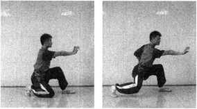 步型跪步:一腿屈膝全脚掌着地;另一腿屈膝,使膝部接近地面, 脚跟离地,臀部坐于小腿上面(图1-186)。