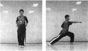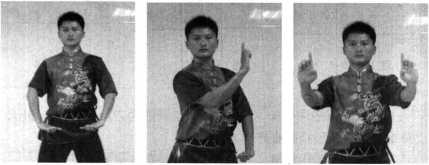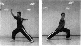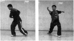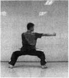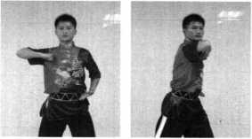 挑肘:并步抱拳,左脚向左迈一步,身体左转成左弓步,右 臂大小臂折叠,以肩为轴向转体后的身体前方由下向上挑击。肘与肩 平,小臂在大臂正上方,拳心向头侧(图1-189)。