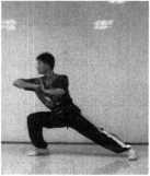 骑龙步:并步抱拳,左脚向右前方上步,脚尖外撇屈膝,右 腿屈膝前跪,脚跟提起,身体对右前弓。上体左转,同时右脚经前向 左前方绕上一步,脚尖内扣,屈膝,左腿屈膝跪腿,脚跟提起,眼向 左看。左脚向左侧上步成左弓步(图1-187)。