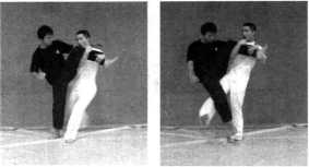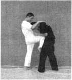 左侧弹腿佯攻对方下肢,当对方运用截腿来阻击时,我方突然进步, 用双手抱其颈后部并用右腿屈髓提膝向前顶击对方胸腹部(图2-43)。