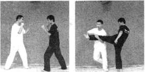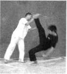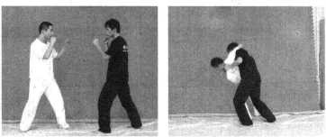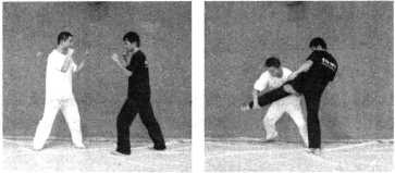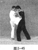 左侧弹腿佯攻对方下肢,当对方运用截腿来阻击时,我方突然 进步,用双手抱其颈后部并用右侧膝顶击对方胸肋部(图2-45)。