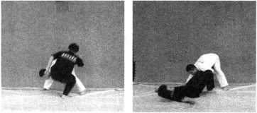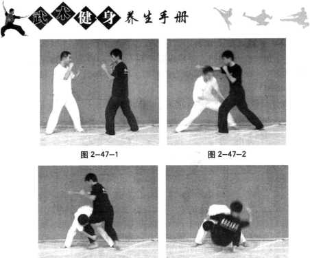 当抱住对方双腿时,对方极可能下压,我方要迅速屈肘,两手 用力回拉,同时用左肩前顶对方靓腹部,将对方摔倒(图2-46-1至 H 2-46-4)。