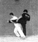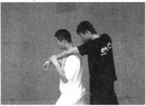 当对方双手抓我方双肩之时,我方双手从其两臂之间上穿并抱 握对方颈背,与此同时,我方右膝急速上顶撞其裆部(图2-61-1至第二章武术搏斗运动共 图 2-61-4)。动作要领:穿臂,抱握颈背同时撞裆