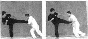 左势站立,上右步蹬地后,及时屈左髓提膝,在左腿下降时, 屈右髓提膝前顶,力达膝部。
