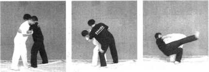 (九)手别摔两人相抱,我方背右步贴近对方,左胯填入,而后用左手别住 对方左腿膝外侧,右手臂锁紧对方左手臂,向右长腰变脸,将对方摔 倒(图 2-54-1 至图 2-54-3)。动作要领:贴近,别腿膝外侧,长腰变脸。