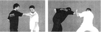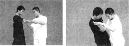对方右手抓我方肩部或胸部时,我方右手掌压拿住对方右手背, 同时右腿向右斜前方进步,随即身体往右稍转,含胸收腹往下沉,同 时左臂屈肘由左上方向内向下砸击对方右臂肘关节,对方臂即断(图 2-55-1,图2—55—2)。