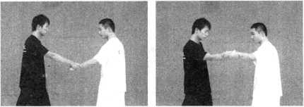 对方右手抓我方左腕时,我方身体左转卷握对方右腕前推,同 时右手托拉对方右手肘关节使其弯屈,迫使对方身体向上、向后仰倒 (图 2-56-1 至图 2—56—4)。