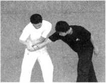 对方左手欲抓我之时,我方双手快速缠抓其左腕,逆时针方向 划弧,与此同时我方身体顺势下潜转身,进肩,拉臂,拱身,从而断