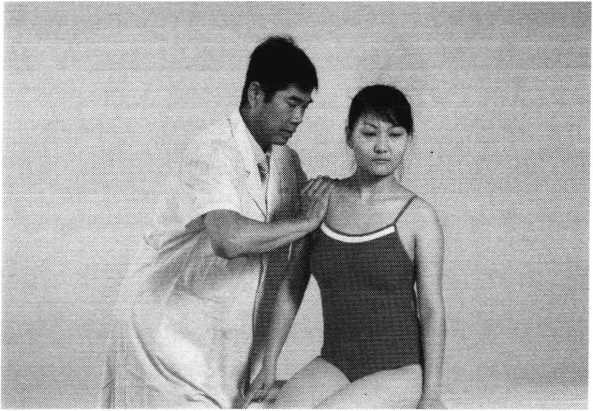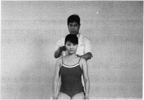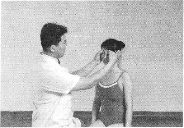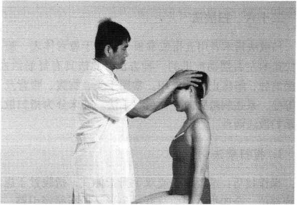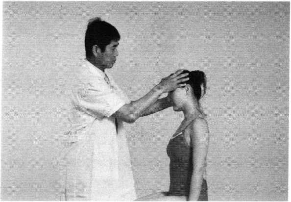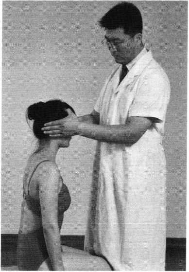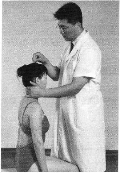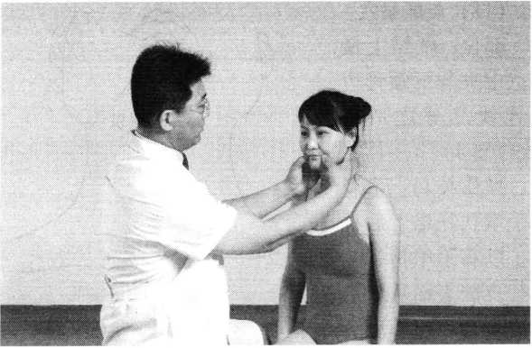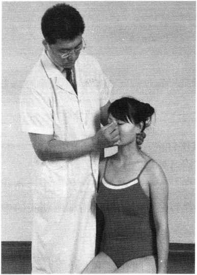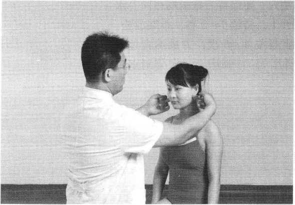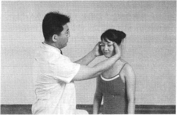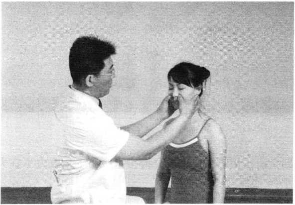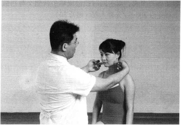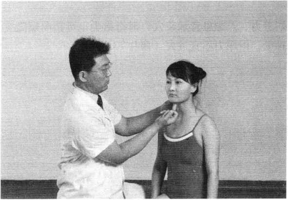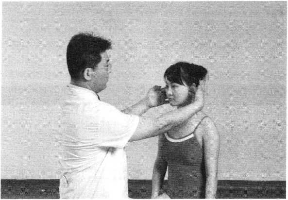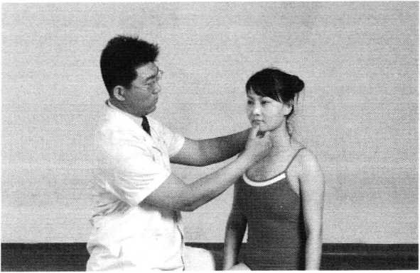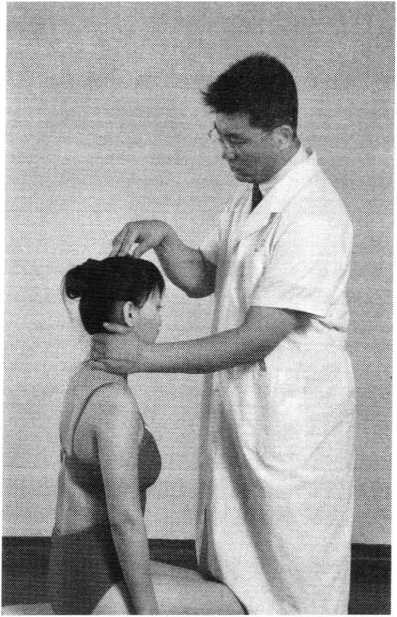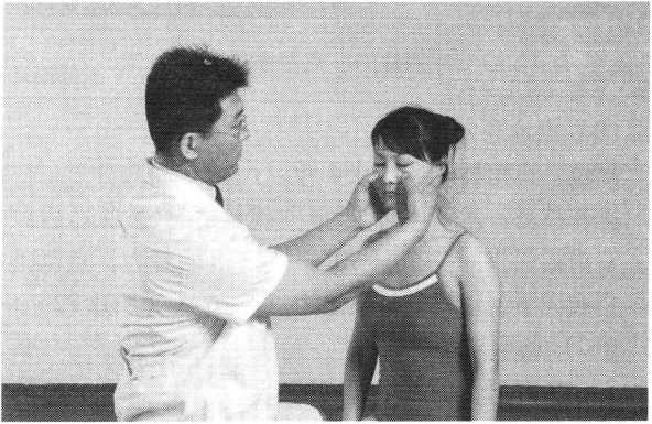 操作技巧:术者 左手掌扶托患者后枕 部,以右手中指指端 朝与皮肤表面垂直的 方向着力,点颤患者廉泉穴。用力轻柔和缓,一般点4〜6次为宜(照片74)。