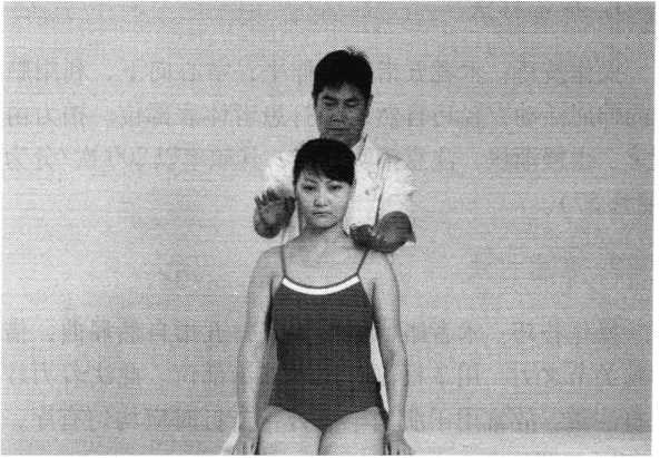 操作技巧:术者双腕背伸、掌指及指间关节自然屈 曲,或双手五指交叉,对准患者施治部位的中心,用全手 或掌心部相对用力(照片54)。按压时用力要均匀,以持 续10秒钟为宜。