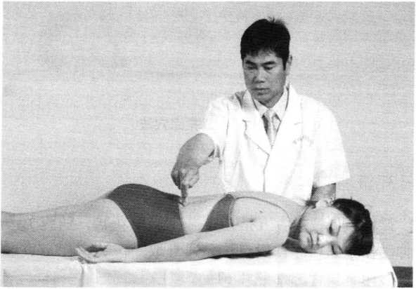 操作技巧:术者五指并拢伸平,掌心向下,利用腕关 节的伸屈活动,轻巧自然地拍打患者体表部位。拍力由轻 渐重,由慢渐快,注意拍实拍准,其频率以200次/分为宜 (照片57)。
