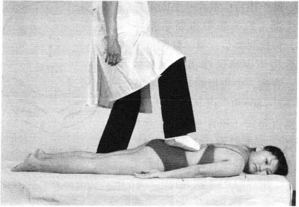 操作技巧:患者俯卧于治疗床上,胸部和大腿中段分 别垫起,术者借助双杠支撑身体,用双足踩踏施治部位。 着力应由轻到重。踩的部位、顺序、方法、施力的大小, 应根据患者的病情及体质决定(照片63)。年老体弱、心 脏功能不良或肿瘤、结核病患者禁用。