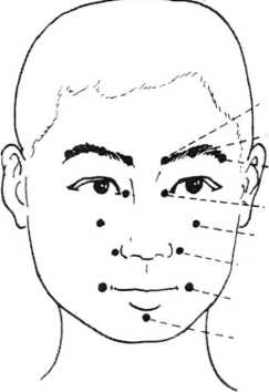操作技巧:体位及操作技巧均同于点鱼腰穴,但需注 意的是点颤丝竹空穴时,拇指指端应朝头的中心方向施力 (照片69)。