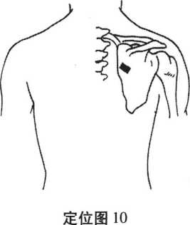 (1)术者一手扶托固定患者对侧肩关节,另一手握空 拳拇指伸直,以拇指指端着力于肩胛冈与肩胛内缘夹角处 (定位图10)