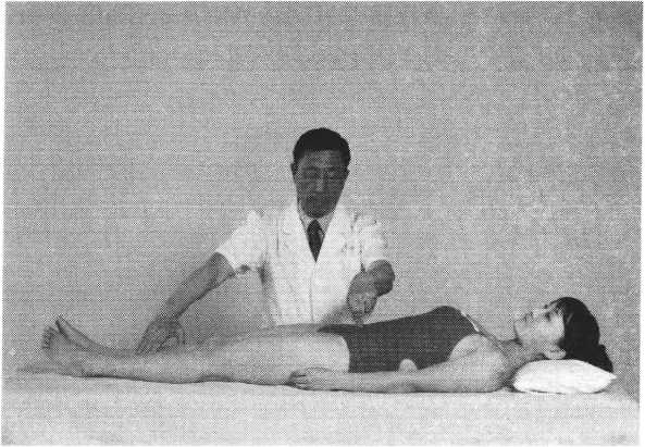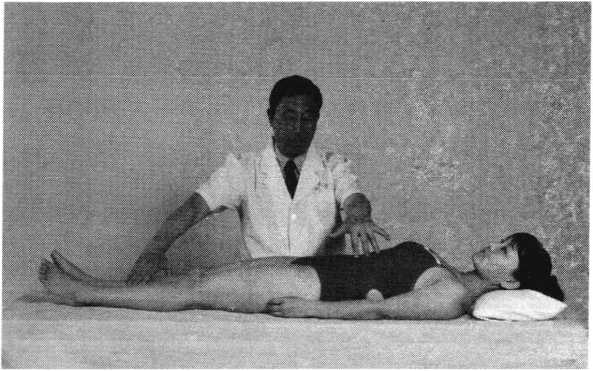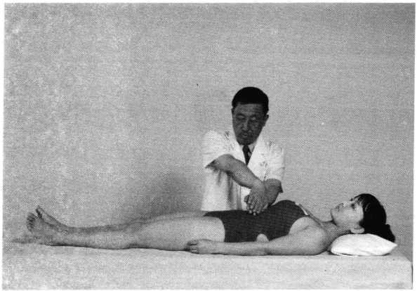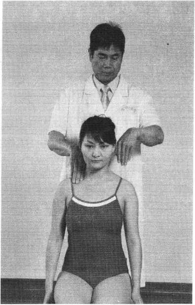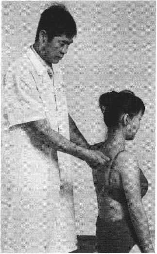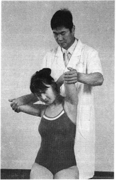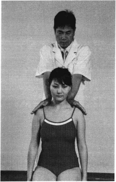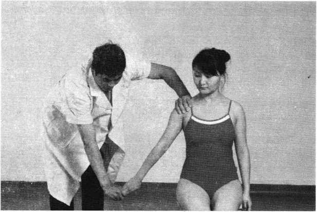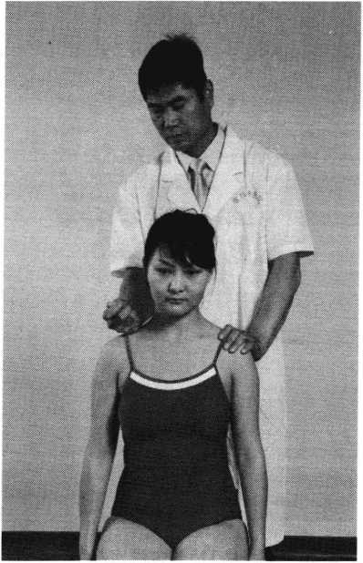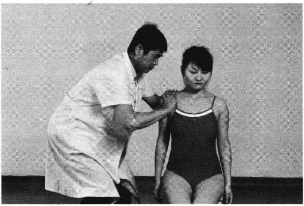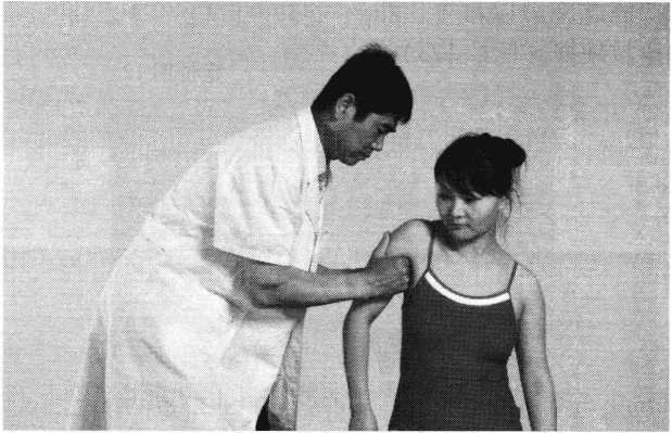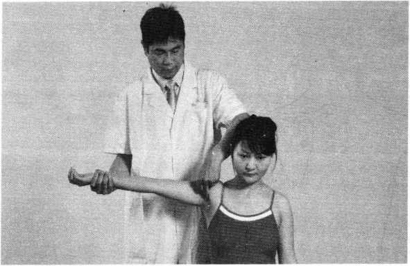 操作技巧:患者双上肢外展屈肘,两手交叉抱于头后 部,术者双手掌心相对分别抵住患者两肘后部,两手交错 用力,使患者肩部作上下、前后回旋摇动(照片119)。用 力协调柔缓,幅度由小渐大,反复4〜6次即可。