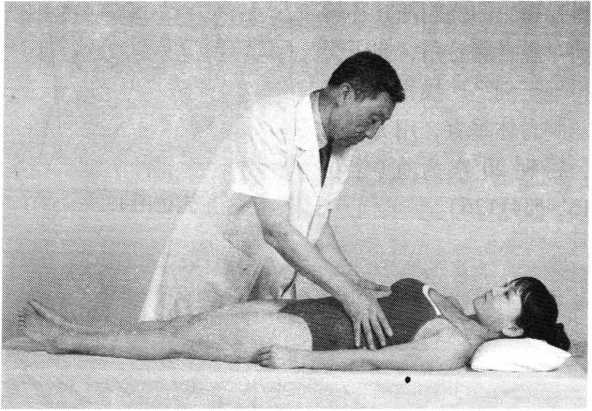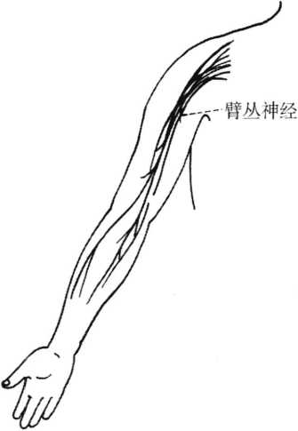 体位同上。患 者上肢外展外旋位,术 者一手扶托病人腕关节, 另一手掌微屈,以中指 指端弹拨其腋窝处的臂 丛神经1~2次(定位图 11)