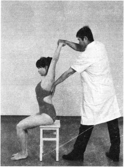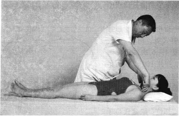 操作技巧:患者双手五指交叉放于头后颈项部,两肘 外展,术者以腹部抵住其后背,两手掌扶按双肘前方,同 时向后用力拉肘,使患肢做扩胸动作(照片120)。连续 4〜6次,注意扩胸要在肩关节生理活动范围内进行。
