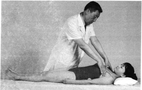 .推法 操作技巧:术者双手掌平贴于患者前胸部,五指伸直 展开,腕关节处于背伸尺偏位,以全手掌力,沿两侧肋 弓,随其自然呼吸频率,从胸骨体同时向两侧分推至腋后 线部,自上而下,反复2〜4次。女性患者推前胸部时需绕 其双乳,用力柔和均匀,呼气时分推,吸气时不推(照片 127) 0