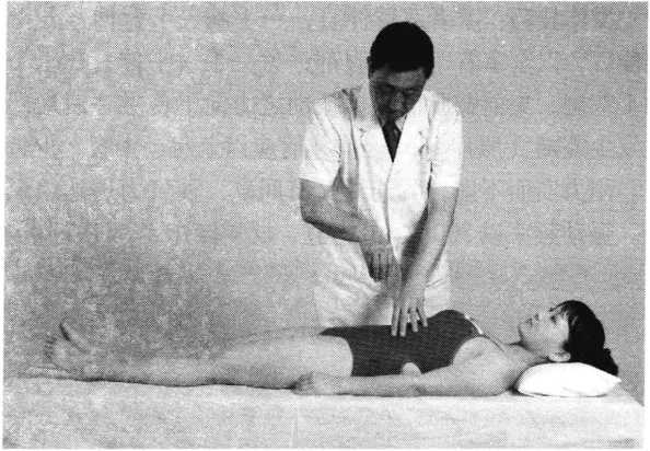 操作技巧:术者屈双肘关节,伸腕关节,两手四指并 拢,掌心相对,插于患者腋窝处的食指槎侧向上着力,两 拇指扳于三角肌下方,再同时向近心端施力。如此同时交 错用力,即是肩关节端提法(照片121)。一般端提2〜4 次为宜,切忌粗暴施治。