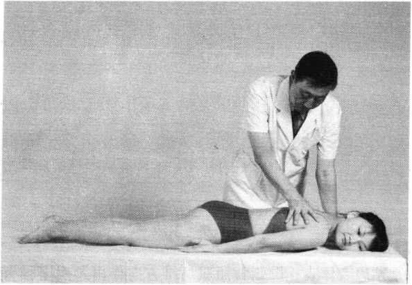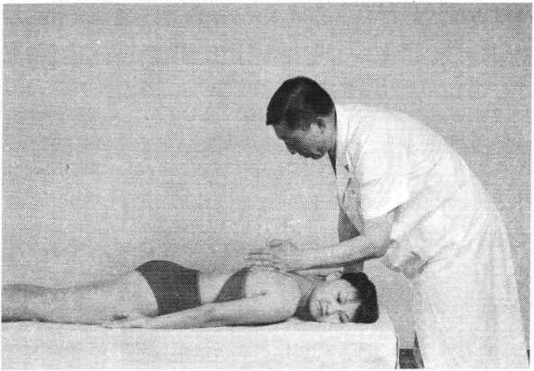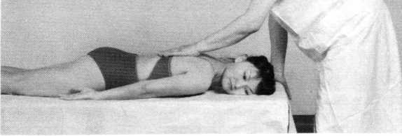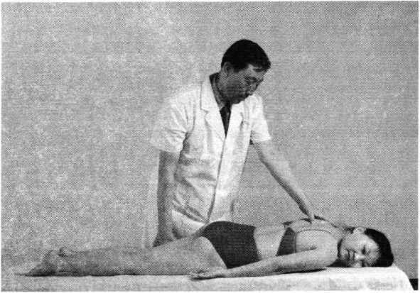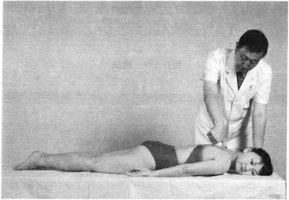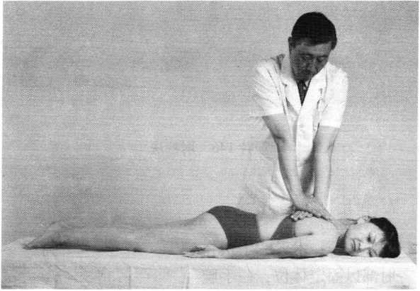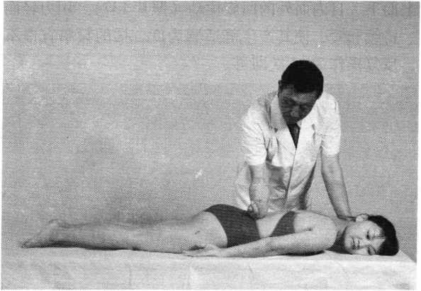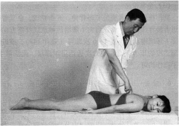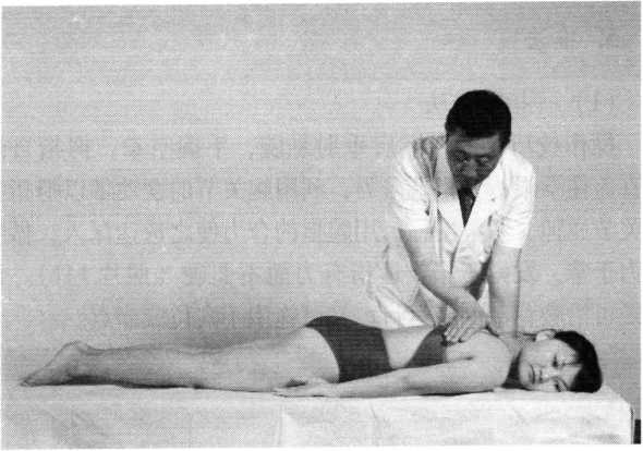 滚床法操作技巧:术者一手向上扶托患者颈后,一手扶于双 小腿前方,并向下按压。如此双手一上一下交错用力,使 患者自臀至肩呈连续滚动状态(照片160)。动作均匀有 序,反复操作2〜4次。