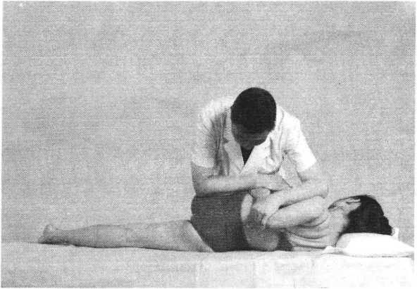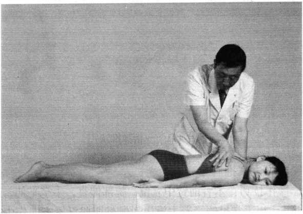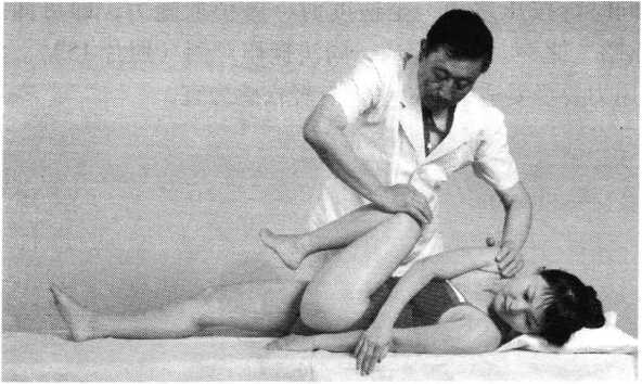 推扳法操作技巧:术者一手托推患者肩关节后方,一手压按 另侧膝部,双手向相对方向同时交错推扳,使患者腰部被 动扭转(照片153)。注意用力应稳妥轻巧。一侧完毕,同 法推扳对侧。