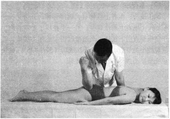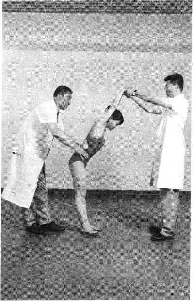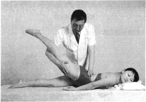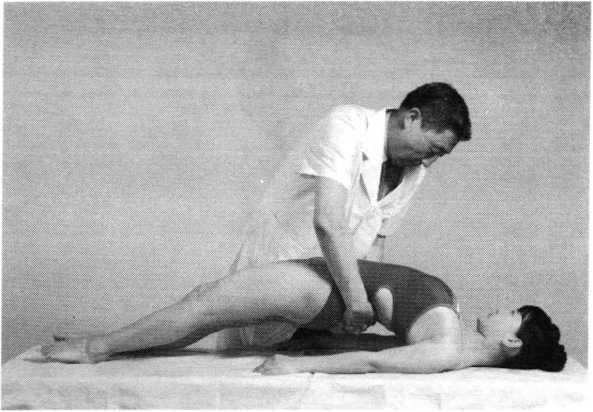 托挺法操作技巧:患者腰部后伸抬臀,术者双手同时用力向 上端托,使其腰臀部离开床面,处于过伸状态(照片 158)0如此反复2~4次,切忌粗暴用力,速度不宜过快。