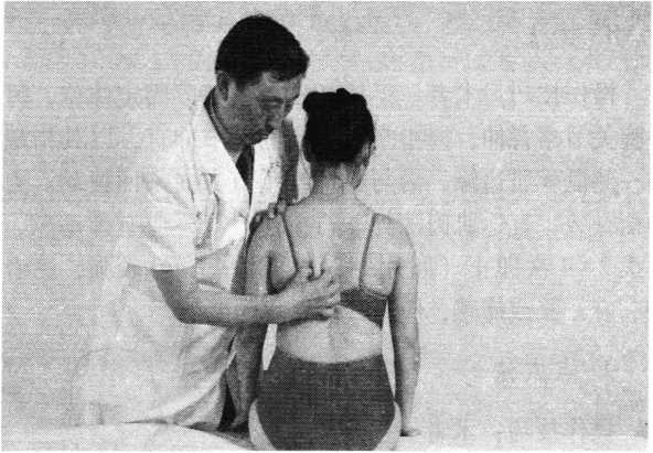 操作技巧:术者一手扶托患者肩部以固定体位,另一 手腕关节略背伸,拇指掌指及指间关节伸直,以其指端深 插一侧舐棘肌边缘,沿与肌纤维垂直方向来回拨动。力度 均衡一致,直达肌肉深处。行拨法时指下应有弹动感,连 续拨2~4次即止(照片148)。此法刺激性较强,患者有 酸、麻、胀或痛感,应以其能忍耐为度。